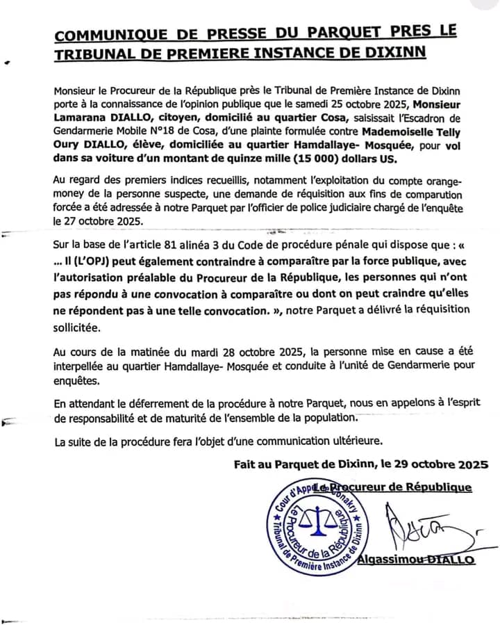 C’est ce qu’indique un communiqué de presse du parquet du tribunal de première instance de Dixinn, publié ce mercredi.