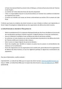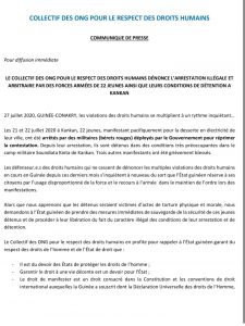 Vingt-deux (22) jeunes ont été interpellés par les forces de l’ordre, les 21 et 22 juillet 2020, lors des manifestations contre la déserte en électricité à Kankan. Dans une déclaration rendue publique ce lundi 27 juillet, le collectif des ONG pour le respect des droits humains a dénoncé leur arrestation.