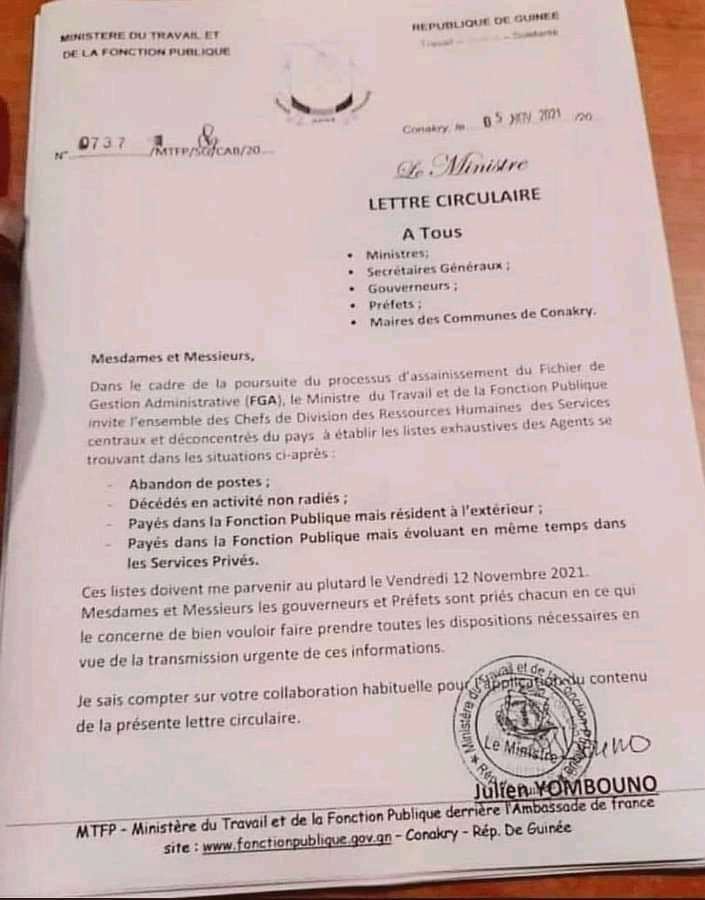 C’est l’un des maux dont souffre la fonction publique guinéenne. Celle-ci est bourrée de fictifs ou d’individus qui perçoivent de salaires sans pourtant être jamais en service. Mais pour mettre fin à cet état de fait qui coûte inutilement assez à l’Etat, le tout nouveau ministre de tutelle a pris une importante disposition dont une copie est parvenue à notre rédaction.