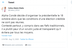 C’est que fustige d’ailleurs, le président de l’Union des Forces Démocratiques de Guinée, (UFDG). « Alpha Condé décide d’organiser la présidentielle le 18 octobre alors que les conditions d’une élection crédible ne sont pas réunies. Contesté partout, y compris dans ses fiefs traditionnels, il a plutôt peur d’un scrutin juste et transparent qu’il évitera par tous les moyens », a tweeté Cellou Dalein Diallo.