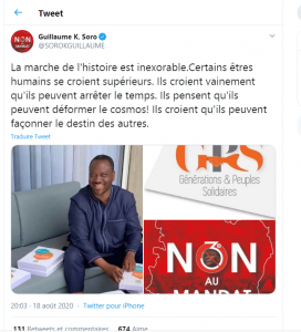 Il a fait cette déclaration sur son compte tweeter. « La marche de l’histoire est inexorable. Certains êtres humains se croient supérieurs. Ils croient vainement qu’ils peuvent arrêter le temps. Ils pensent qu’ils peuvent déformer le cosmos!Ils croient qu’ils peuvent façonner le destin des autres. Le peuple ivoirien dira son histoire » a lancé Guillaume Soro, candidat à la présidentielle d’octobre.
