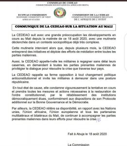 Coup d’état au Mali : la CEDEAO appelle les militaires à regagner sans délai leurs casernes (Communiqué)