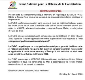 Le FNDC note avec satisfaction le communiqué de la CEDEAO en date 18 août 2020 rappelant la ferme opposition de notre organisation sous-régionale à « tout changement politique anticonstitutionnel ».