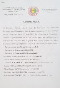 L’ex patron de l’ASCAD ainsi que 6 autres personnes sont accusés par la CRIEF d’un détournement de plus de 2 milliards 700 millions de francs guinéens.