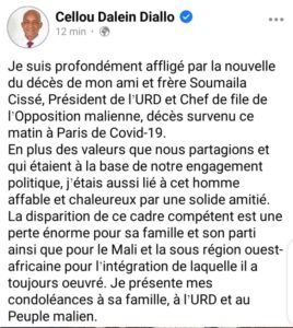 Le décès de l’opposant malien, Soumaila Cissé, continue à faire l’objet de réactions. Dans un post sur sa page Facebook, Cellou Dalein parle d’une « perte énorme » pour la famille du défunt, le parti de ce dernier et la sous région-ouest africaine.