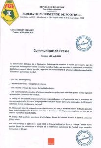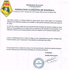 Suite aux recommandations du tribunal arbitral du sport (TAS), la commission d’éthique de la fédération guinéenne de football vient d’ouvrir une nouvelle procédure d’enquête ce jeudi 20 aout, contre Amadou Diaby ex-vice président. A cet effet, elle annonce une suspension de 90 jours contre le concerné, à titre conservatoire.