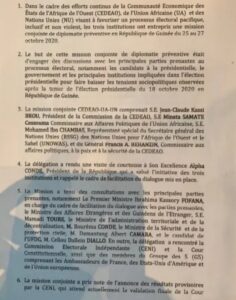 La mission des Etats de l’Afrique de l’Ouest (CÉDÉAO), de l’Union africaine (UA) et de l’ONU « exhorte » dans un communiqué « les autorités guinéennes à lever ce dispositif dans la perspective d’un dialogue inclusif », au lendemain d’une rencontre avec Elhadj Mamadou Cellou Dalein Diallo à son domicile, où il affirme être séquestré depuis plusieurs jours par les forces de l’ordre.