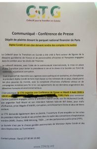 Le Collectif pour la Transition en Guinée (CTG) basé en France, porte plainte contre le président guinéen, son fils Mohamed Alpha Condé et son intendant Kabinet Sylla dit  »Bill Gâte’ au parquet de Paris pour fait de corruption, enrichissement illicite et abus de biens sociaux. C’est dans un communiqué rendu public ce samedi 1er aout 2020, que le collectif l’a fait savoir.