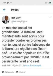 « Le malaise social est grandissant. A Kankan, des manifestants sont sortis pour protester contre les promesses non tenues et contre l’absence de la fourniture régulière en électricité. La colère populaire étouffée provisoirement par COVID-19 est persistante .Wait and see! », Indique l’ancien président du parti UDD.