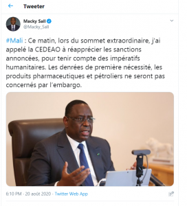 « Ce matin, lors du sommet extraordinaire, j’ai appelé la CEDEAO à réapprécier les sanctions annoncées, pour tenir compte des impératifs humanitaires. Les denrées de première nécessité, les produits pharmaceutiques et pétroliers ne seront pas concernés par l’embargo », a indiqué le président sénégalais dans un tweet.