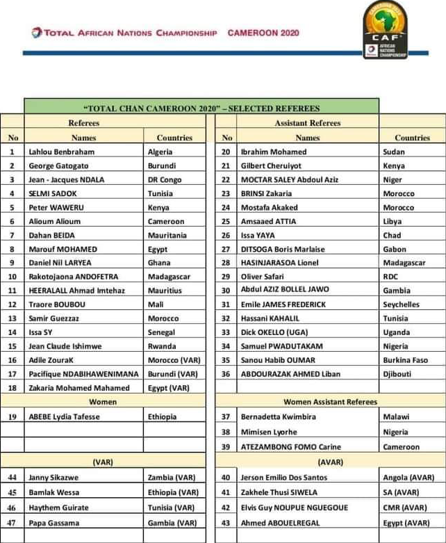 Malgré la présence de la Guinée dans la compétition, aucun de ses arbitres n’a été sélectionné par la confédération africaine de football. La liste de ceux qui auront la charge d’arbitrer les différents matchs, a été publiée ce samedi 09 janvier 2020.