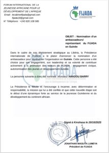 Président de l’Union Citoyenne pour l’Emergence de la Guinée (UCEG), Amadou Barry vient de bénéficier de la confiance du Forum International de la Jeunesse Africaine pour le Développement de l’Afrique (FIJADA) en le nommant comme « Ambassadeur » du FIJADA en République de Guinée. Cette nouvelle est tombée ce mardi 20 octobre 2025, sur la table de l’UCEG une plate-forme de la société civile guinéenne.