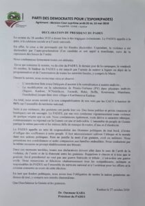 Dans une déclaration dont nous avons obtenu, une copie, Dr. Ousmane Kaba dénonce des fraudes et condamne les violences en cours et appelle les leaders politiques à la préservation de la paix. Il n’a pas manqué de révéler que 56% de ses voix, n’ont pas été comptabilisés par la  »CENI ».