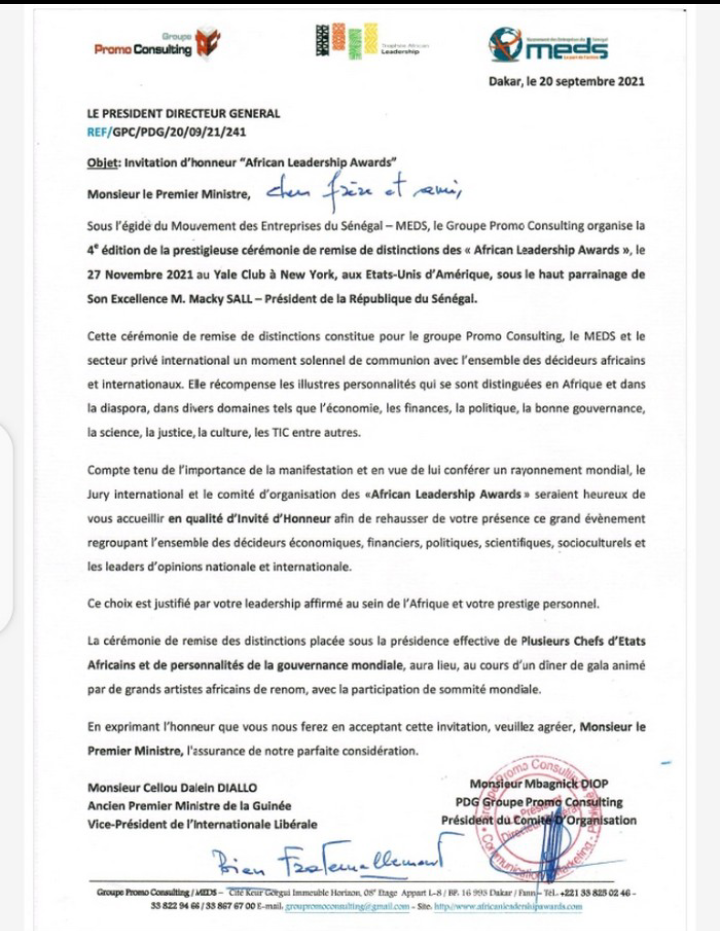 C’est une nouvelle invitation de taille à l’international pour Cellou Dalein Diallo. L’ancien premier ministre est sollicité à la quatrième édition d’African Leadership Awards, prévue à New-York le 27 Novembre prochain. L’objectif vise à récompenser les personnalités africaines qui ont fait preuve d’exploit dans différents domaines à savoir l’économie, la bonne gouvernance, la finance… L’évènement se déroulera sous le parrainage du président sénégalais, Macky Sall.