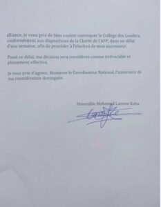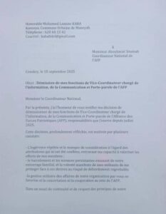 Mohamed Lamine Kaba, jusque-là Coordinateur de la communication et porte-parole de l’Alliance des Forces Patriotes a démissionné de son poste. L’ancien député a adressé une lettre ce vendredi 19 septembre 2025 à Aboubacar Soumah, Coordinateur national de cette structure, soutien du CNRD.