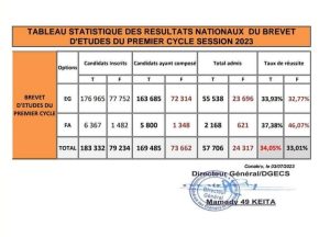 Quelques jours après la correction des épreuves, le ministère de l’enseignement pré-universitaire et de l’alphabétisation vient de rendre public la physionomie des résultats du Brevet d’Etudes du Premier Cycle session 2023, ce lundi 03 juillet via sa page Facebook. Cette année le taux est de 34,05% de réussite.