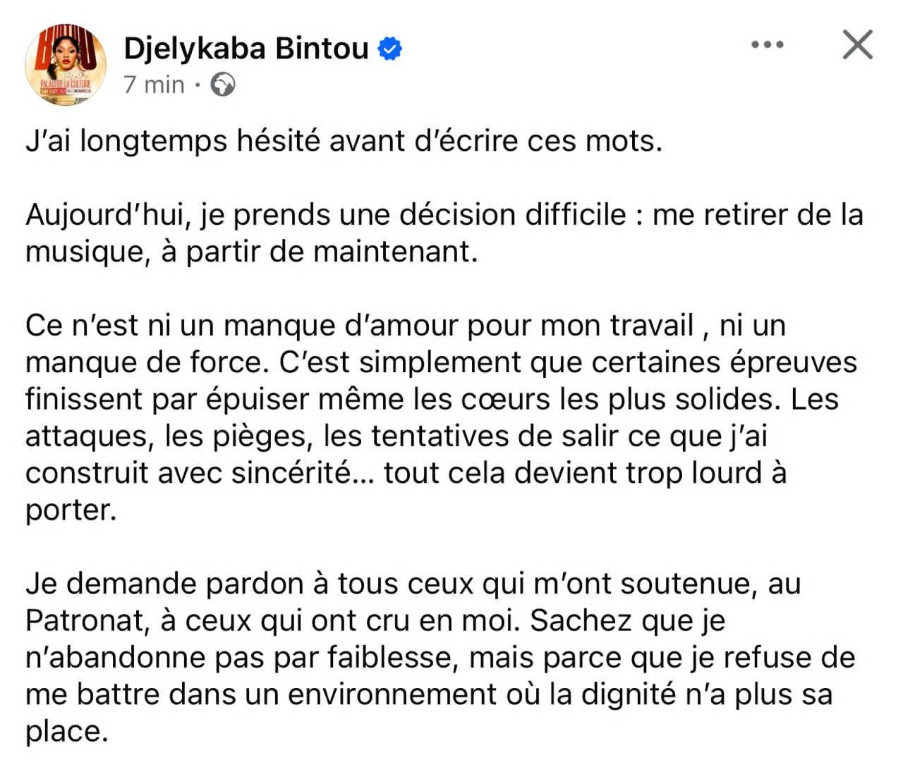 L’artiste dénonce notamment « des attaques, des pièges » et des tentatives visant à ternir son image, des pressions qu’elle juge désormais trop lourdes à supporter. Malgré tout, elle insiste sur le fait que ce choix ne traduit aucune faiblesse, mais plutôt une volonté de préserver sa dignité.