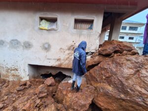 « J’étais assise avec la fille qui habite à l’étage. Elle m’a dit qu’elle avait sommeil. Entre-temps, un jeune qui dormait dans la chambre d’à côté est arrivé. Pendant que je regardais la télé dans ma chambre, j’ai soudainement entendu un grand bruit dehors. Le mur s’est effondré, toute la maison a tremblé, et nous sommes tous sortis en courant », a témoigné Mabinty SOUMAH, une riveraine.