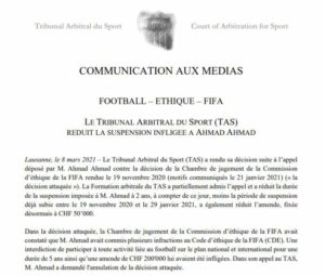 Le TAS estime qu’Ahmad a violé le code d’éthique de la FIFA en finançant notamment le pèlerinage à La Mecque de plusieurs présidents de fédérations de football africaines, mais l’instance a en revanche considéré qu’il n’y a pas suffisamment d’éléments pour conclure que le boss du football africain a fait preuve de favoritisme en nouant un contrat avec la firme Tactical Steel au moment du CHAN 2018.