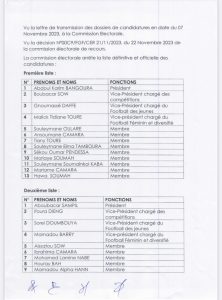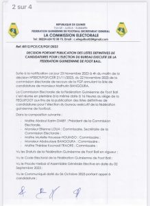 A l’issue d’une plénière ce jeudi 23 novembre 2023, qui s’est tenue au siège de la fédération guinéenne de football, les listes définitives retenues pour le congrès électif du 25 novembre ont été rendue publique par la commission électorale.