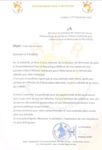 Le Rassemblement Pour la République vient d’annoncer sa démission au sein de l’alliance nationale pour la démocratie et développement. C’est à travers une lettre publiée sur les réseaux sociaux ce dimanche 07 septembre 2025 que Diabaty Doré, président du RPR a annoncé son retrait de la coalition dirigée par Cellou Dalein DIALLO.