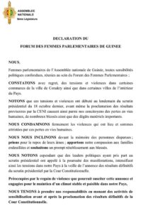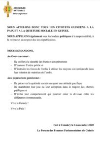 AccueilFemme à la Une Crise post-électorale : importante déclaration du forum des femmes parlementaires de Guinée Par fatala - 6 novembre 2020 0 756 FacebookTwitterPinterestWhatsApp