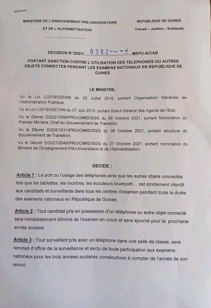 Quelques semaines après avoir interdit le port et l’usage des téléphones et tout autre appareil connectable dans les écoles pendant les cours, la même décision vient d’être élargie aux examens nationaux. Désormais, aucun appareil électronique n’est permis dans les centres qui vont abriter ces évaluations. La mesure vise à ramener la rigueur dans la formation des élèves guinéens.