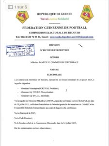 De nouveau rebondissement dans la crise au sein de la Fédération Guinéenne de Football, suite à une décision rendue lundi 28 juillet 2025, par la commission électorale de recours qui rejette l’élection partielle des membres du Comité Exécutif.