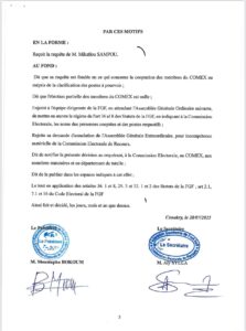 Saisi par Mikailou Sampou, candidat malheureux au bureau exécutif de la FGF, la Commission Électorale de Recours a jugé sa requête fondée en ce qui concerne la cooptation des membres du COMEX, dénonçant « un mépris de la clarification des postes à pourvoir ».