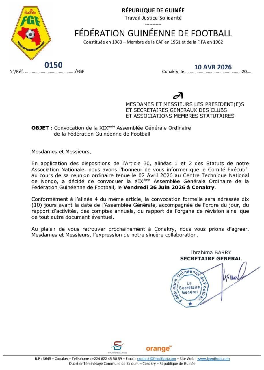 La Fédération Guinéenne de Football franchit une nouvelle étape dans la gestion du football national. À travers une correspondance officielle datée du 10 avril 2026, l’instance dirigeante annonce la convocation de sa XIXᵉ Assemblée Générale Ordinaire, prévue le vendredi 26 juin 2026 à Conakry.