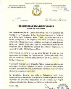 Guinée-Fête de Tabaski : Les fidèles musulmans autorisés à faire la prière dans les mosquées et les places publiques