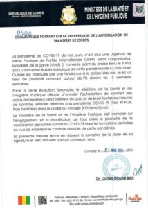 A la uneSanté Guinée : le Ministre de la santé annule les autorisations de transfert des corps de l’extérieur vers l’intérieur du pays Par Mohamed Diakite - 21 mars 2024 0 603 FacebookTwitterPinterestWhatsApp F. Camara.