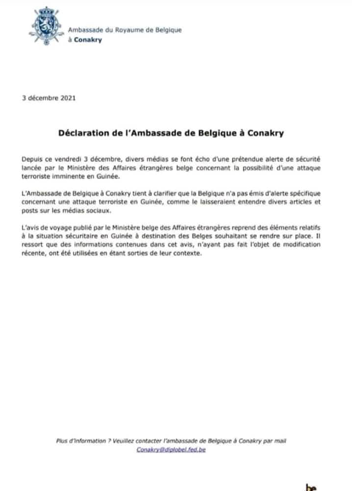 C’est une sorte de démenti qu’a faite l’ambassade de Belgique en Guinée. Selon cette représentation diplomatique, le royaume « n’a pas émis d’alerte spécifique concernant une attaque terroriste en Guinée…». Plusieurs médias guinéens avaient pourtant avancé le contraire dans la journée du vendredi, 03 décembre 2021. C’est par une déclaration dont une copie est parvenue à notre rédaction, que ladite ambassade a apporté cette clarification.
