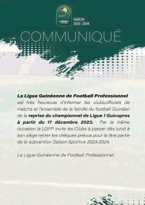 Arrêté après les deux premières journées, le championnat guinéen de Ligue 1 va se poursuivre ce mois-ci. L’annonce a été faite ce vendredi 8 décembre 2023 par la Ligue Guinéenne de Football Professionnel via sa page facebook. Elle fixe la reprise au 17 décembre prochain.