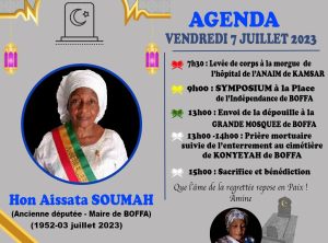 Le Président Sidya TOURE et le Bureau Exécutif National de l’Union des Forces Républicaines (UFR) ont la profonde douleur de faire part à l’ensemble des militantes, militants et sympathisants du Parti ainsi qu’au peuple de Guinée, du décès de l’honorable Aissata SOUMAH, ancienne députée-maire de Boffa et Présidente du Bureau National des Femmes de l’UFR. Décès survenu, le lundi 3 juillet 2023, à l’âge de 71ans à Boffa, des suites de maladie.