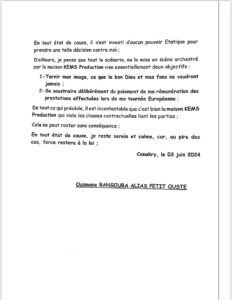 Interdit de prester sur le plan national et international à travers un communiqué de sa maison de production, l’artiste Ousmane Bangoura alias Petit Ousté ne semble pas se laisser faire. Il sort du silence pour faire le point de ce bras de fer via un communiqué d’où, il remet en cause la décision de Kem’s production l’interdisant de prester.
