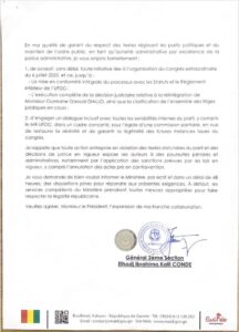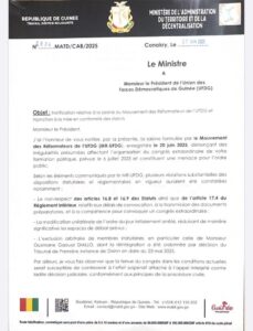 Cette décision prise par le Ministre Ibrahima Kalil Condé intervient suite à une requête déposée par le Mouvement des Réformateurs de l’UFDG, l’application de la décision de réintégration de Ousmane Gaoual DIALLO. Mais aussi de trouver solution aux autres problèmes internes du parti enfin de procéder à une bonne organisation de congrès.